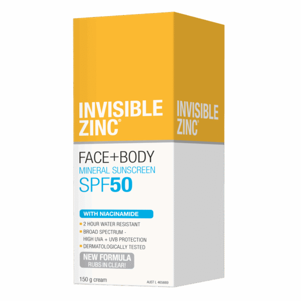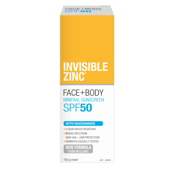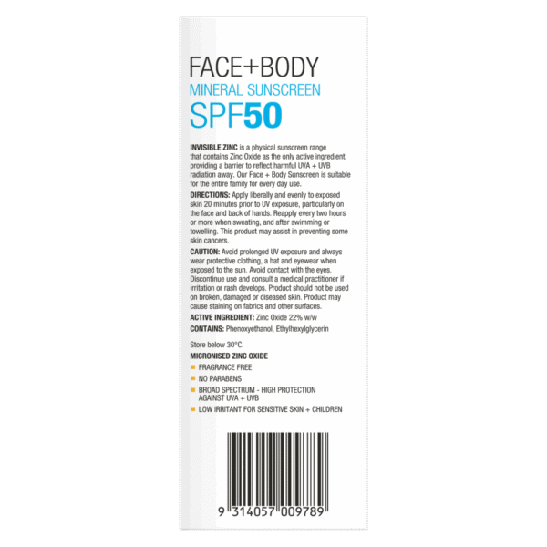 INVISIBLE ZINC FACE + BODY Mineral Sunscreen SPF 50 is a physical sunscreen that contains Zinc Oxide to create a barrier to reflect the sun’s harmful UVA and UVB rays. It provides 2 hours water resistance and is suitable for the whole family for every day use. Use daily to protect your skin and help reduce the appearance of premature skin ageing.