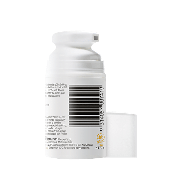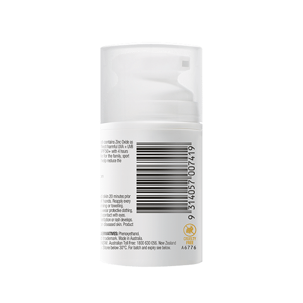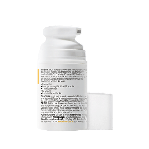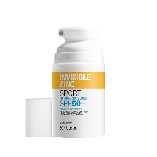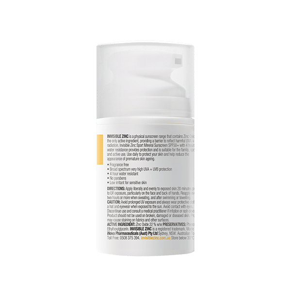 INVISIBLE ZINC SPORT Mineral Sunscreen SPF 50+ is a physical sunscreen that contains Zinc Oxide to create a barrier to reflect the sun’s harmful UVA and UVB rays. It is suitable for the family, sport and active use and provides 4 hours water resistance. Use daily to protect your skin and help reduce the appearance of premature skin ageing.